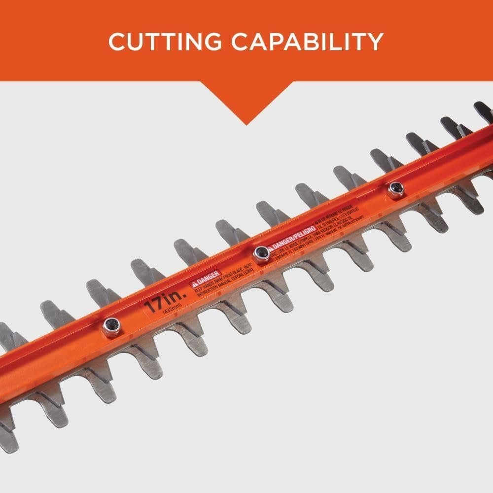Equipped with a dual-action hardened steel blade, this hedge trimmer delivers smoother, cleaner cuts with reduced vibration. The powerful motor provides efficient cutting performance, helping you tackle branches up to 5/8 inch thick with confidence. This combination of power and precision makes it ideal for routine lawn care and detailed hedge shaping.